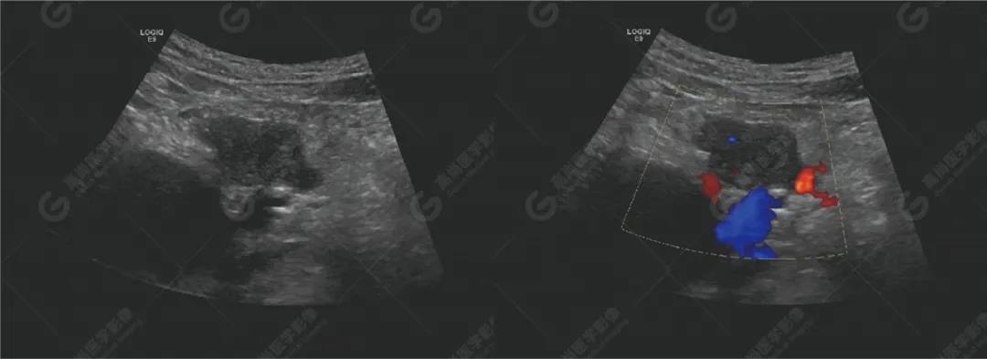 腹膜后可見數(shù)個低回聲,較大約25mm×13mm,邊界清,形態(tài)不規(guī)則,部分相互融合,CDFI顯示其內(nèi)可見點(diǎn)狀血流信號。