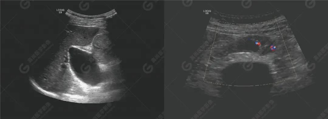 肝門處探及一大小約66mm×40mm的梭形無回聲,上方與膽總管相連,下方顯示不清,壁光滑,內(nèi)透聲好,未見明顯異?;芈?,CDFI顯示內(nèi)未見血流信號。肝內(nèi)膽管左支稍擴(kuò)張,呈平行管征。