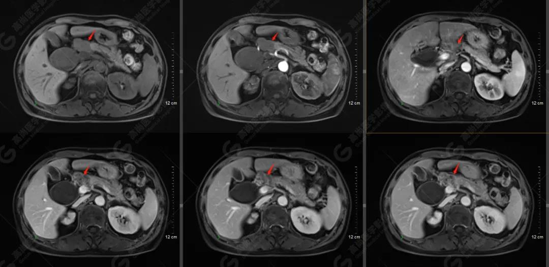 MR檢查所見:胰頭可見結(jié)節(jié)狀異常信號影,大小約2.5×1.8cm,T1WI呈稍低信號,T2WI呈略高信號,信號欠均勻,DWI可見彌散受限,病灶與周圍正常胰腺組織分界欠清,Gd-DTPA增強(qiáng)掃描病灶呈明顯不均勻強(qiáng)化;病灶相應(yīng)節(jié)段上方膽總管明顯囊腫擴(kuò)張,大小約6.4×4.0cm。肝內(nèi)膽管輕度不均勻擴(kuò)張,以左支為著,呈軟藤征。胰管未見擴(kuò)張。胰頭上緣及腹膜后(腹主動脈旁)見腫大淋巴結(jié),增強(qiáng)掃描可見中度強(qiáng)化,部分強(qiáng)化不均勻;腹腔未見積液。
