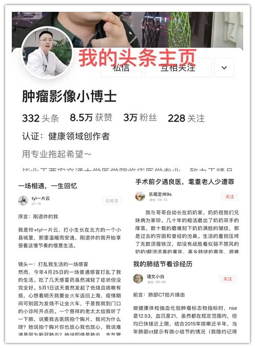 “巫勇醫(yī)生從事影像工作二十載,日復(fù)一日年復(fù)一年都在緊張和忙碌中度過,卻從未有過怠倦感。但就在年初,在接觸和了解網(wǎng)絡(luò)科普之后,看到無數(shù)的患者因?qū)︶t(yī)學(xué)常識(shí)缺乏感到恐慌、因無法明確治療方向而焦慮、甚至有的因誤診而失去生命……再看看自己身著的白大褂,一種無力感油然而生,出于醫(yī)者的本能,內(nèi)心有一種聲音不斷地驅(qū)使我,那就是:我還可以做更多、更多……