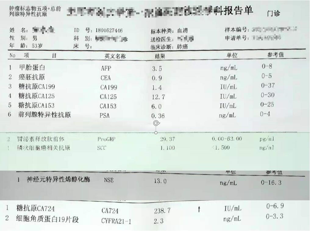 男性,53歲,頭暈半月入院,CT發(fā)現(xiàn)肺內(nèi)腫塊,雙肺多發(fā)大小不等實性及粟粒樣結(jié)節(jié),雙肺門及縱隔多發(fā)腫大淋巴結(jié)。病程中無發(fā)熱、胸悶氣及胸部不適。既往:左側(cè)肋骨外傷史。
