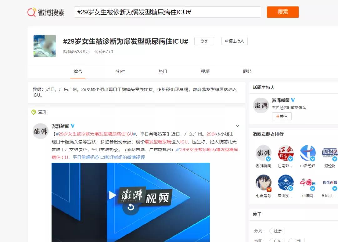 近期一條#29歲女生被診斷為爆發(fā)型糖尿病住ICU#的話題沖上了熱搜。據(jù)廣東電視臺(tái)報(bào)道,近日廣州的林小姐出現(xiàn)口干腹痛頭暈等癥狀,多臟器出現(xiàn)衰竭,確診爆發(fā)型糖尿病送入ICU。醫(yī)生稱,她入院前幾天曾喝十幾支甜飲料,平日常喝奶茶。