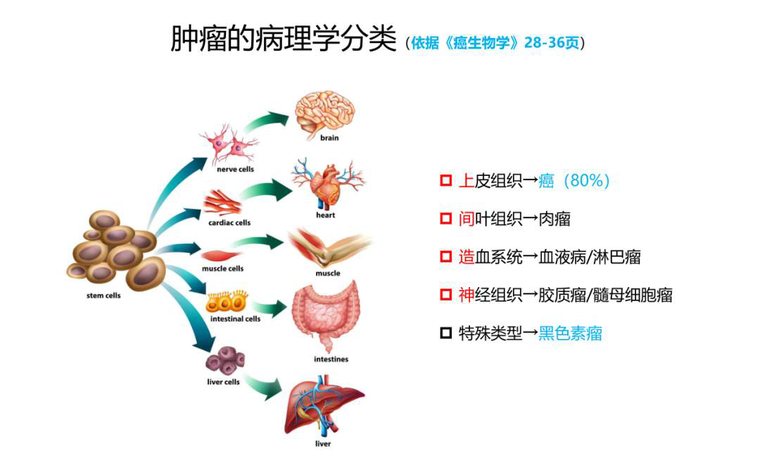 根據(jù)腫瘤組織來源可分為5類:上皮組織來源腫瘤,肉瘤,造血系統(tǒng)惡性腫瘤,神經(jīng)外胚層瘤,以及特殊類型腫瘤。