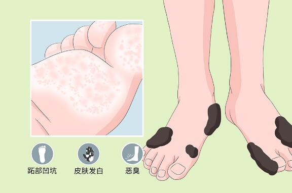 窩狀角質(zhì)松解癥比較常見(jiàn)的癥狀有腳臭、皮疹。好發(fā)夏季、多見(jiàn)于足多汗者,常累及足趾跖面、跖前部、足跟。皮疹為多數(shù)散在的淺表角質(zhì)層剝蝕,呈環(huán)狀或點(diǎn)狀,直徑約2~4mm,邊緣可繞以深色黑溝而呈火山口狀。病損呈膚色、褐色或黑色。伴多汗者可呈白色浸漬,有惡臭。