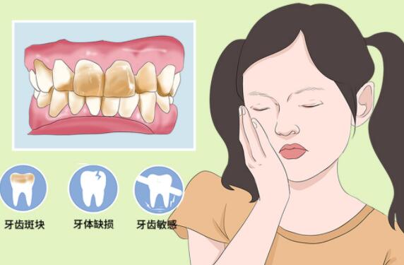1.輕者牙齒表面有白堊或棕色線條、斑塊。嚴重時,可出現(xiàn)缺損,染色深且無光澤。