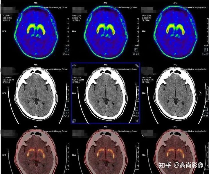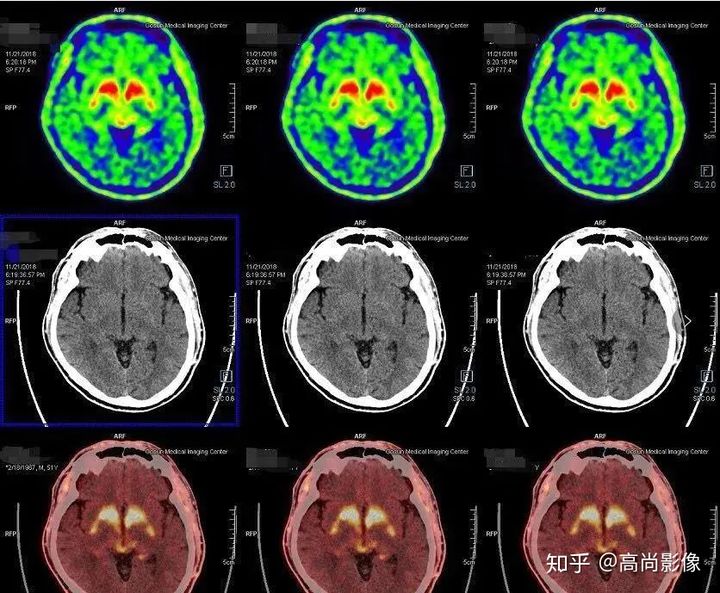 相比之下,童大媽就沒有這么幸運(yùn)了。除了右邊身子總是抖動,童大媽還有嗅覺障礙、動作緩慢等癥狀。童大媽的PET/CT檢查結(jié)果符合帕金森的表現(xiàn),為臨床診斷提供了重要依據(jù)。