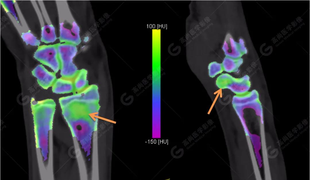 雙能CT骨髓成像圖上發(fā)現(xiàn)了左側(cè)橈骨遠(yuǎn)端和右側(cè)舟狀骨骨髓水腫(箭頭所示),進(jìn)一步查體這兩處骨髓水腫剛好與患者的局部壓痛點(diǎn)相一致。