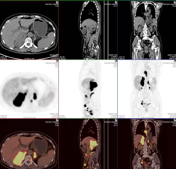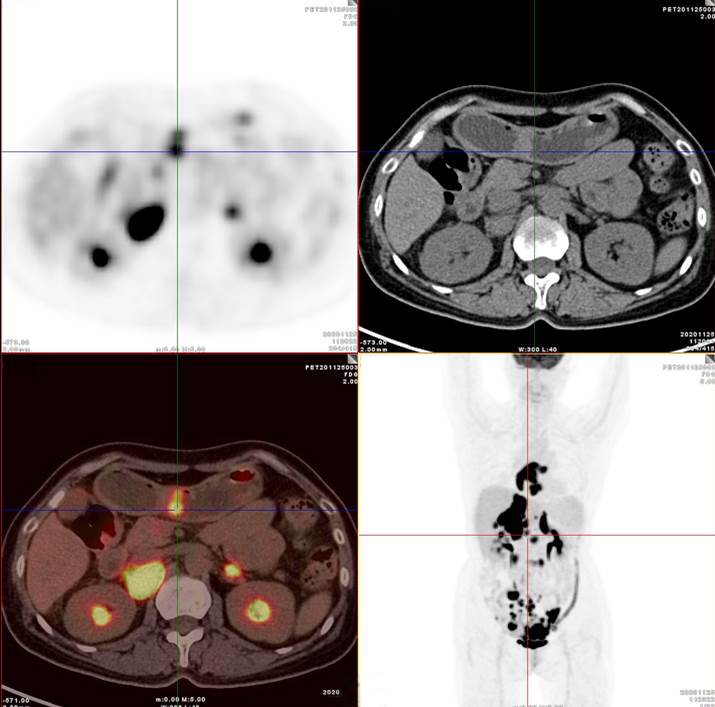 膽囊及雙腎上腺病灶、腹膜后淋巴結(jié)放射性攝取明顯增高