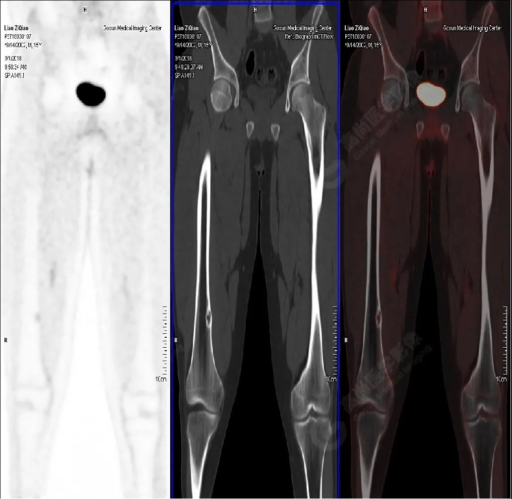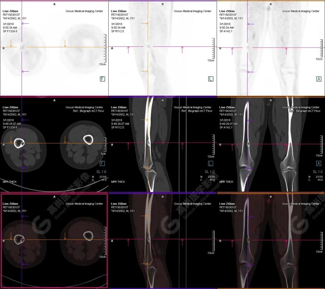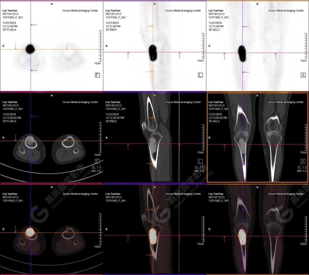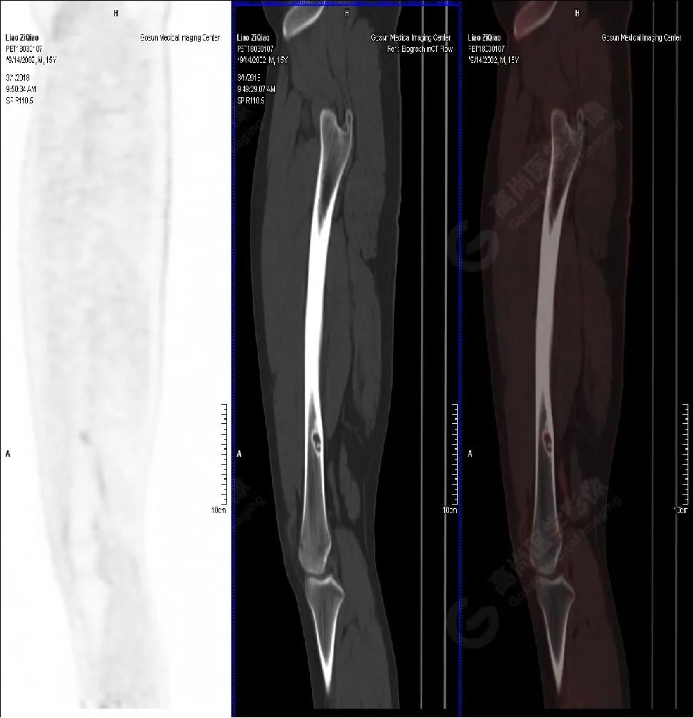右側(cè)脛骨上段髓腔內(nèi)見卵圓形塊狀高密度影,長徑與脛骨長軸平行,邊界清楚,密度欠均勻,CT值介于287.0Hu~425.0Hu,放射性攝取增高,SUV最大值為15.8,平均值為13.1。