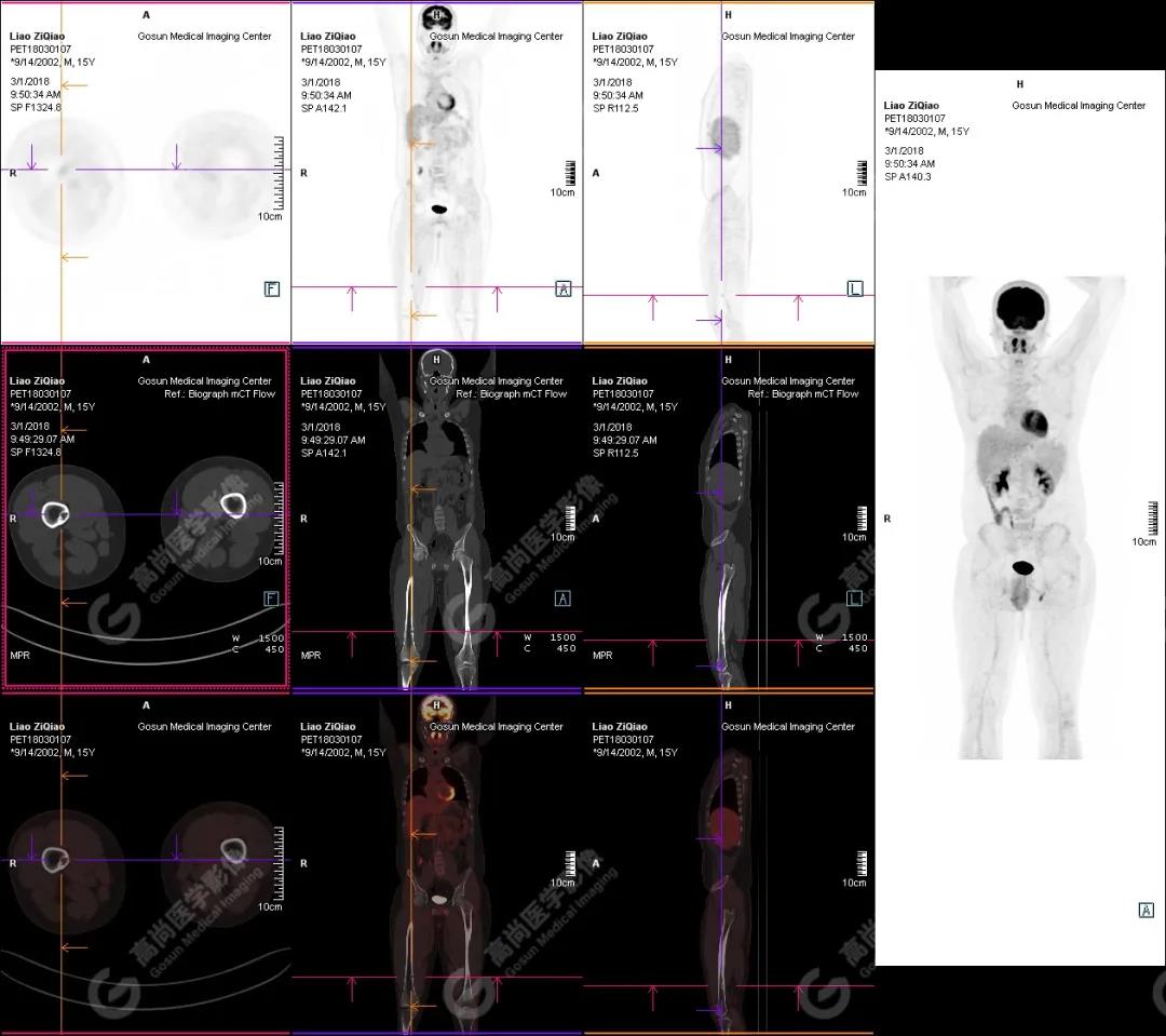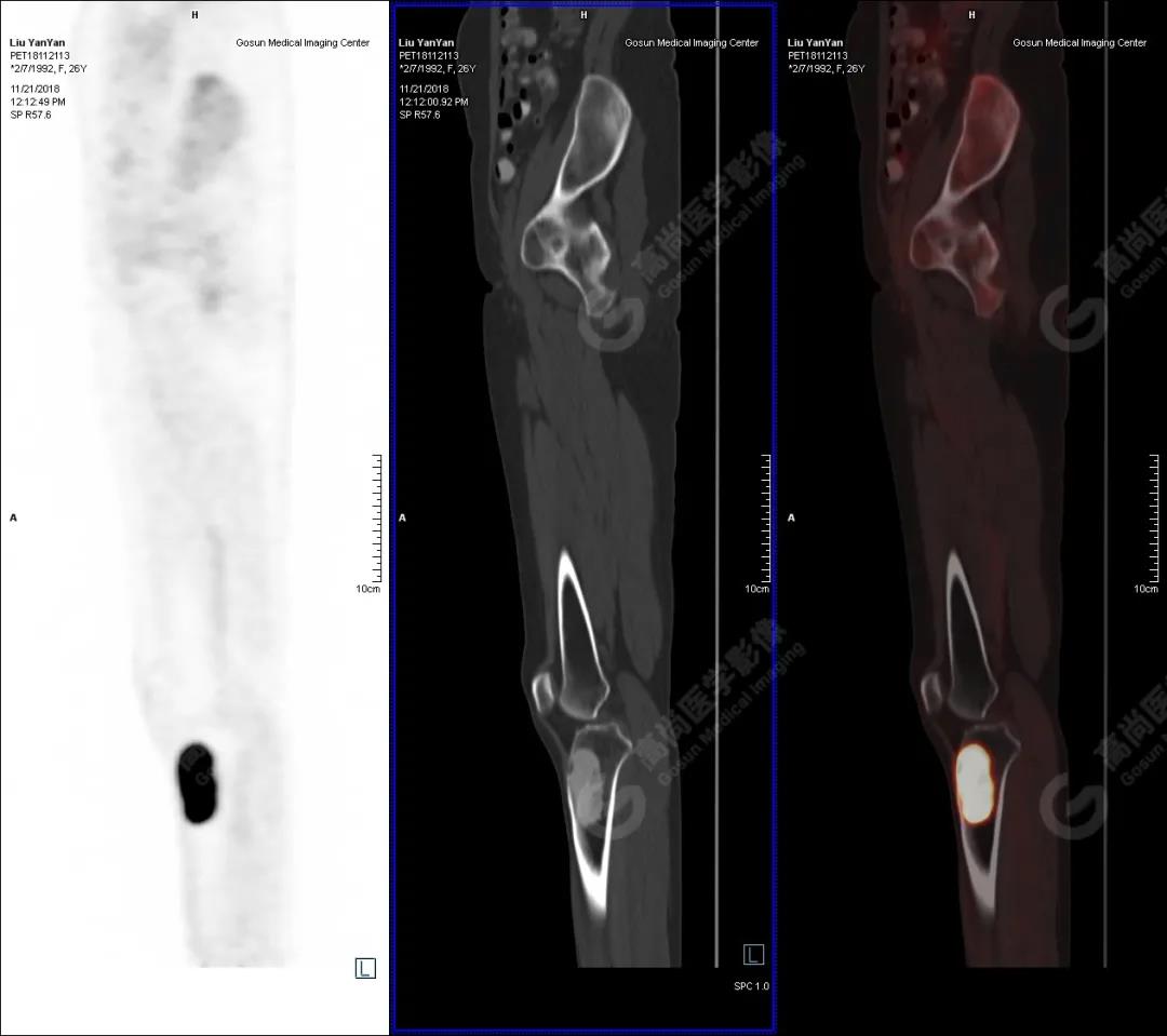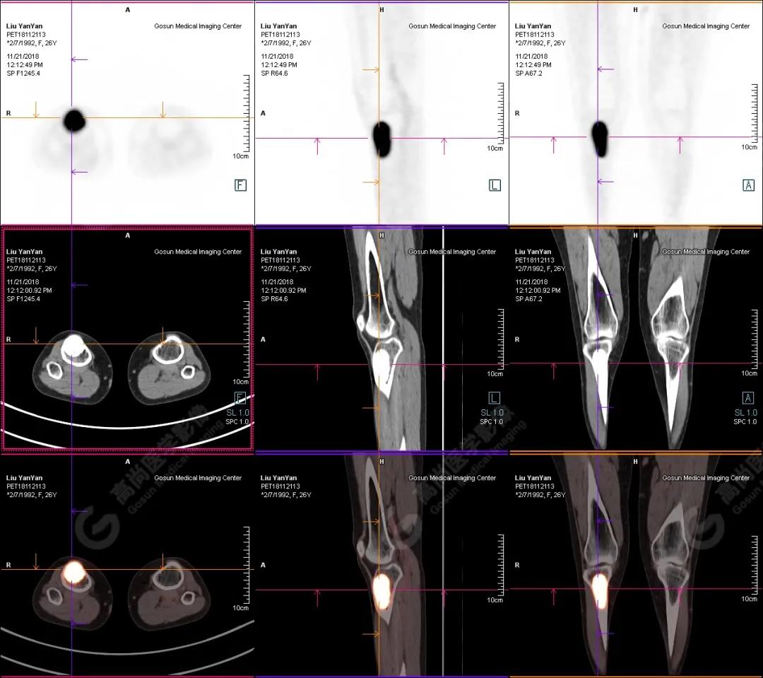 右側(cè)脛骨上段髓腔內(nèi)見卵圓形塊狀高密度影,長徑與脛骨長軸平行,邊界清楚,密度欠均勻,CT值介于287.0Hu~425.0Hu,放射性攝取增高,SUV最大值為15.8,平均值為13.1。
