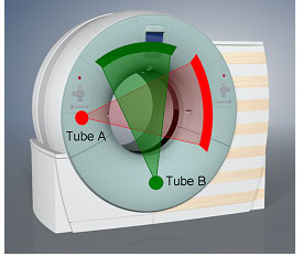 傳統(tǒng)螺旋CT由于僅有一套X射線發(fā)生裝置和一套探測(cè)器系統(tǒng),所以在掃描高速運(yùn)動(dòng)物體時(shí)(比如冠狀動(dòng)脈)并不太佳。通常情況下,工程師通過加快CT的旋轉(zhuǎn)速度來提高其對(duì)運(yùn)動(dòng)物體的撲捉能力,但是受限于工業(yè)水平和CT旋轉(zhuǎn)時(shí)產(chǎn)生的離心力,最快的CT也只能達(dá)到0.27秒旋轉(zhuǎn)一圈。