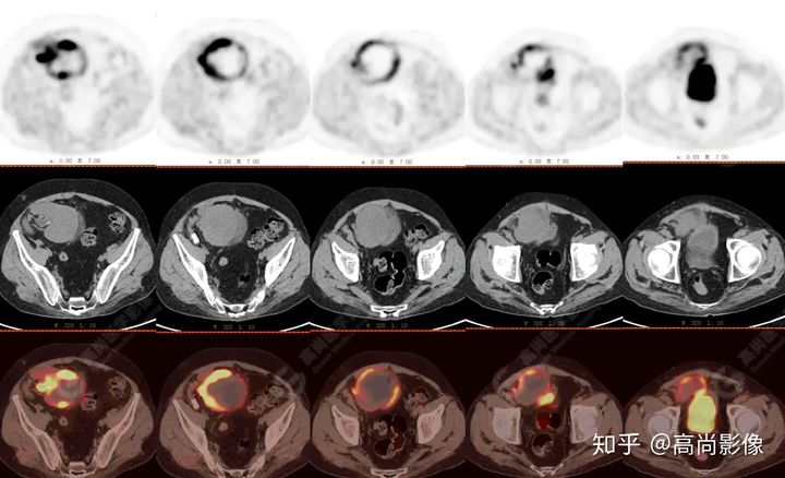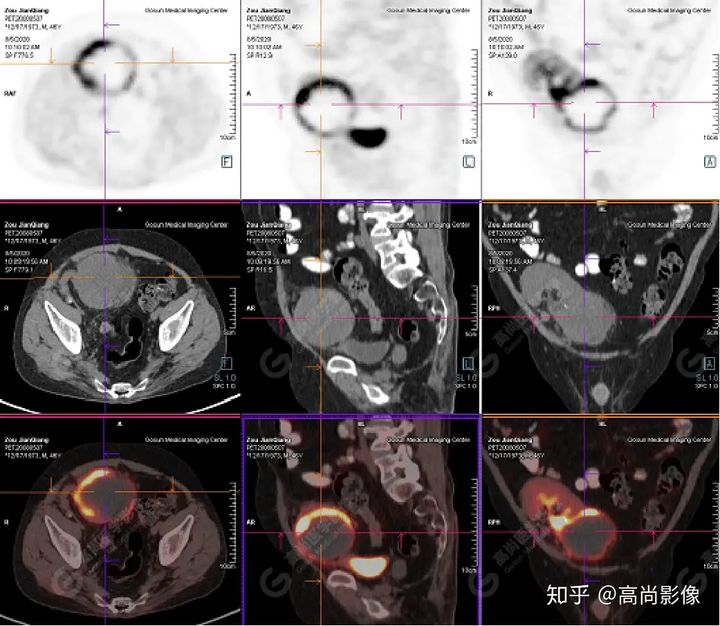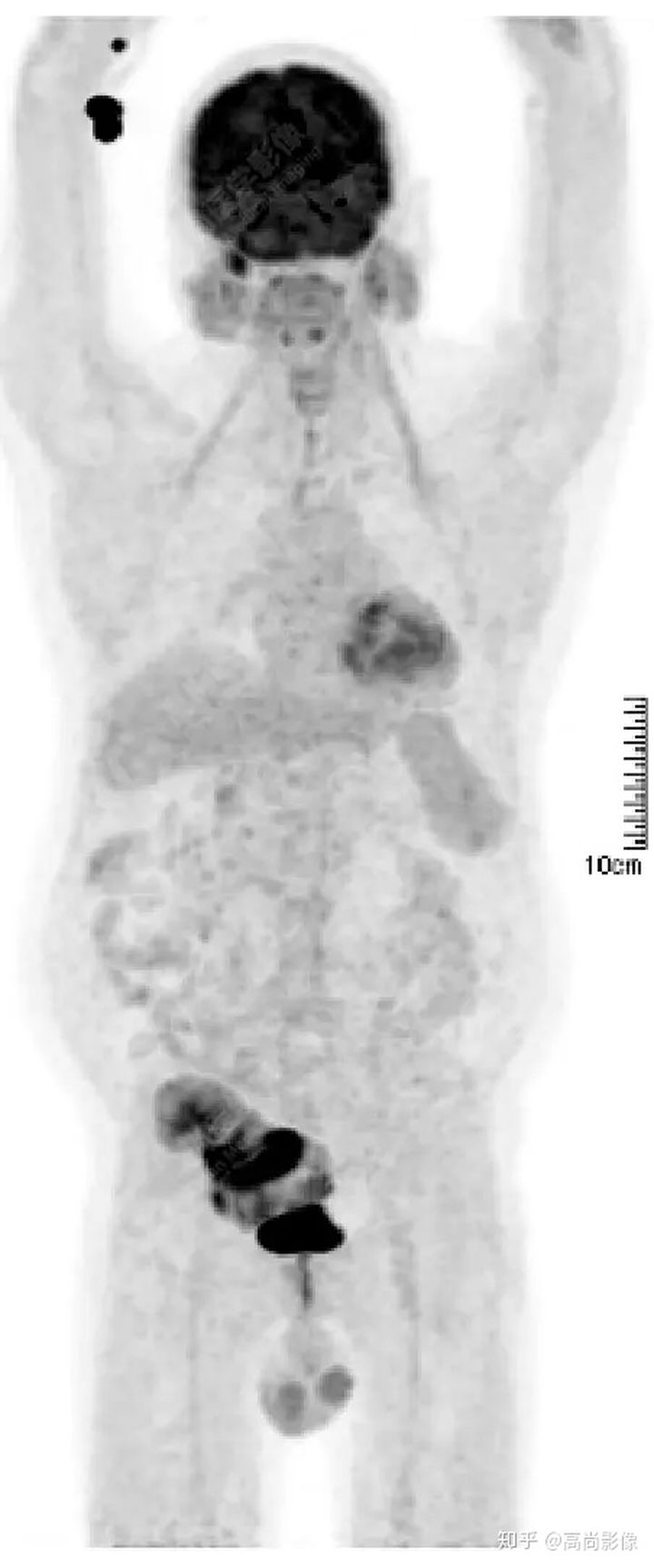 發(fā)現全身其它部位有無結內或結外淋巴瘤病灶。由于淋巴瘤組織多具備高代謝、大范圍無氧酵解的特性,葡萄糖需求量為正常組織細胞的20~30倍,正電子湮滅產生的光子信號聚集于灶區(qū),PET捕獲后可半定量分析其分布特征【4】。
