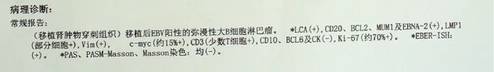 移植腎腫物穿刺活檢病理:移植后EBV陽性的彌漫大B細胞淋巴瘤。