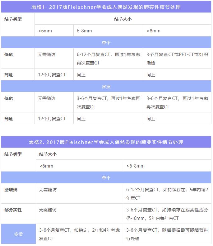 根據(jù)肺結(jié)節(jié)直徑的大小,我們又將肺結(jié)節(jié)分為高、中、低危結(jié)節(jié)。但是,目前尚無(wú)統(tǒng)一的標(biāo)準(zhǔn),不同指南之間存在不能達(dá)成一致的地方,這里提供兩種分類(lèi)標(biāo)準(zhǔn)。