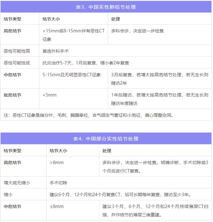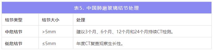 二是《中國(guó)肺部結(jié)節(jié)分類(lèi)、診斷與治療指南》中提出的分類(lèi)標(biāo)準(zhǔn),更適合我們中國(guó)人(具體見(jiàn)表3、4、5)。