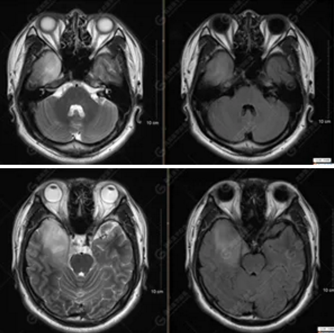 【MRI平掃及增強檢查所見】右側(cè)額顳島葉、右側(cè)海馬及右側(cè)基底節(jié)區(qū)見一團(tuán)塊狀異常信號影,累及右側(cè)下丘腦及視交叉,大小約5.1cm×4.5cm×4.3cm,呈長T1長T2信號,F(xiàn)LAIR序列呈等、稍高信號,DWI序列呈稍高信號,ADC圖高信號,增強后無明顯強化;病灶周圍見片狀長T1長T2水腫信號影,F(xiàn)LAIR序列呈高信號,病灶內(nèi)見右側(cè)大腦中動脈穿行。余腦實質(zhì)內(nèi)未見局灶性信號異常,增強后未見異常強化。右側(cè)側(cè)腦室輕度受壓,余腦室、腦池大小、形態(tài)均正常,中線結(jié)構(gòu)居中