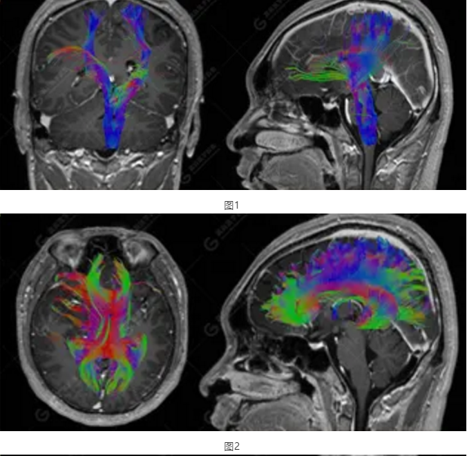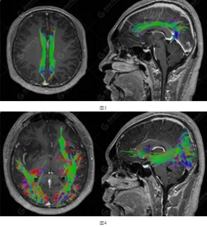 以上為DTI成像,圖1為皮質(zhì)脊髓束,圖2為胼胝體束,圖3為扣帶回束,圖4為額枕束。DTI成像示右側(cè)額枕束前部明顯受壓、部分未見顯示;胼胝體束、雙側(cè)扣帶束、皮質(zhì)脊髓束及左側(cè)額枕束形態(tài)可,纖維束未見明顯破壞,未見明顯稀疏減少。