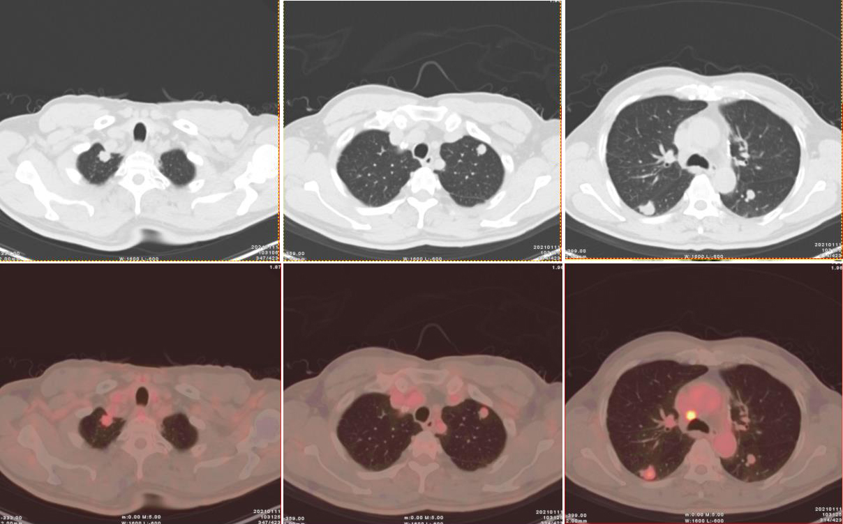 圖2、3:(上為CT橫斷位圖像,下為橫斷位融合圖像):雙肺多發(fā)結(jié)節(jié),部分可見(jiàn)淺分葉,邊緣可見(jiàn)段毛刺,代謝輕度增高。