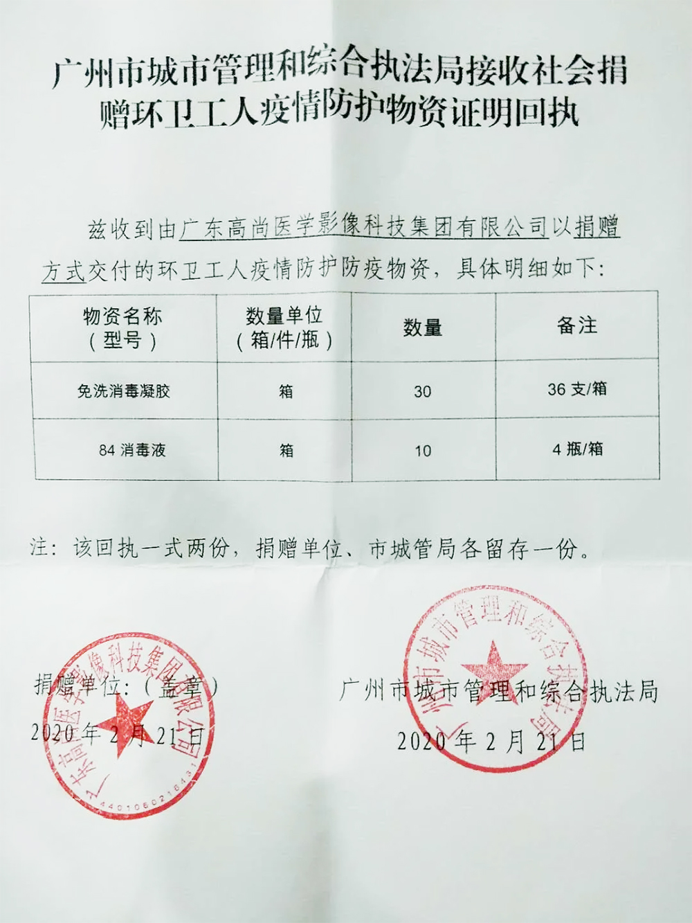 庚子鼠年的春節(jié),他們放棄了春節(jié)與家人團(tuán)聚的機(jī)會(huì),投入到環(huán)境整治一線,為切斷病毒來源、抗擊疫情堅(jiān)守在自己的崗位。高尚醫(yī)學(xué)影像關(guān)愛保障民生的守崗戰(zhàn)士,向廣州市城市管理和綜合執(zhí)法局捐贈(zèng)免洗消毒凝膠1080瓶、84消毒液10箱等一批消毒物資,用于環(huán)衛(wèi)工人在工作中消毒防護(hù)。
