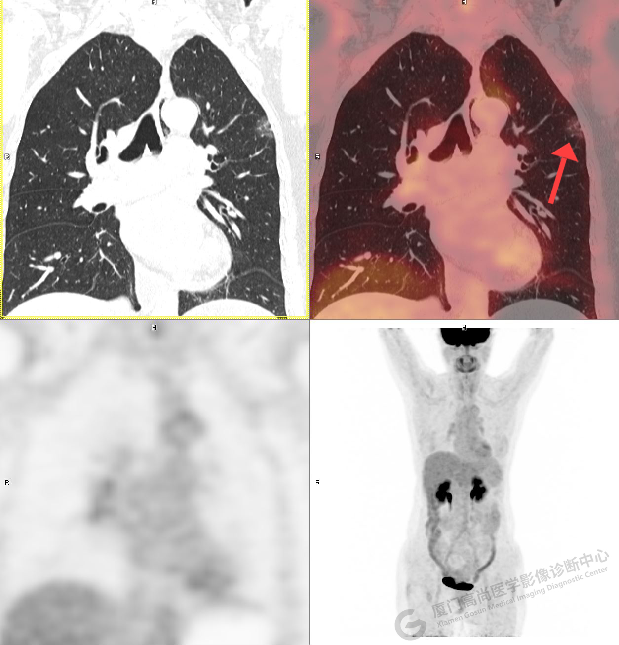 PET/CT示:右肺上葉尖段混雜密度結(jié)節(jié),代謝不高,考慮為早期肺癌(微浸潤腺癌),建議病理學(xué)檢查。