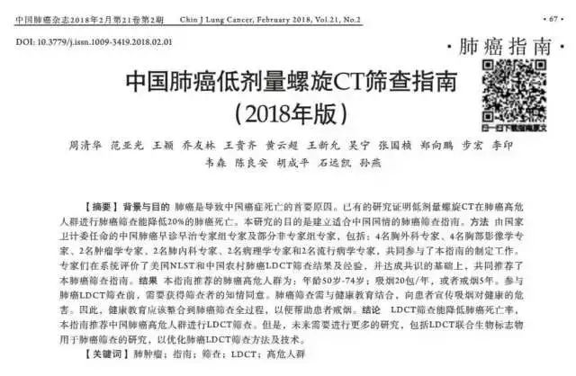 《中國肺癌雜志》2018年2月刊刊登了一篇名為《中國肺癌低劑量螺旋CT篩查指南(2018年版)》,文中分析了CT對(duì)于肺癌早期篩查的意義,并推薦吸煙或者有肺癌家族史等高危人群進(jìn)行CT篩查肺癌。